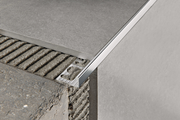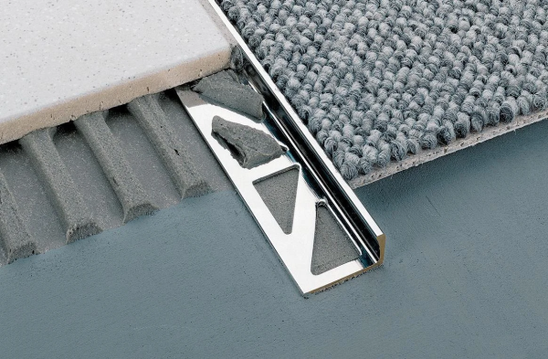 Г-образный профиль, предназначен для отделки наружной кромки (угла, торца) керамической плитки, а также отделки стыков с комбинированным покрытием пола и разграничения поверхностей. Устанавливается под плитку, имеет большой срок эксплуатации.